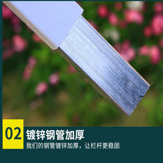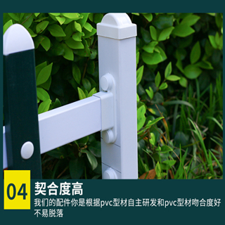 pvc塑鋼護欄花池草坪小柵欄結構特點;pvc塑鋼護欄由橫梁,豎桿,立柱等幾大部分組成,橫梁表面為pvc內部有鋼管內襯,豎桿為pvc材質,立柱內部也有內襯,這種護欄有塑料與鋼結構組成,所以稱為塑鋼護欄,pvc塑鋼護欄,這種護欄兼顧鋼材的強度和pvc的美觀特性,表面光潔,耐腐蝕,不褪色,色彩亮麗,稱為最具裝飾效果的精品小柵欄,pvc塑鋼護欄高度30-180cm/橫桿尺寸一般為36*56cm/立桿20*46cm/立柱58*78cm/88*88cm/121*121cm;立桿間距16cm/長度一般3.08m/套。