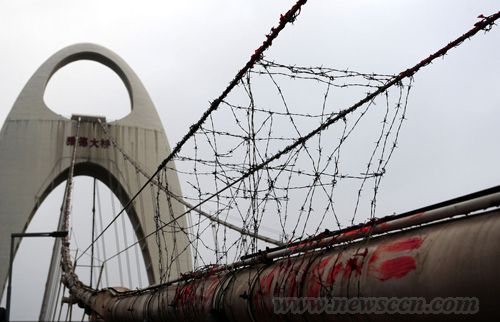 5月9日,廣州獵德大橋的鋼索上,布滿了帶有鉤刺的鐵絲網。由于近期獵德大橋接連上演“跳橋秀”,相關部門對鋼索加裝了這種布滿鉤刺的鐵絲網,防止有人再次爬上獵德大橋。